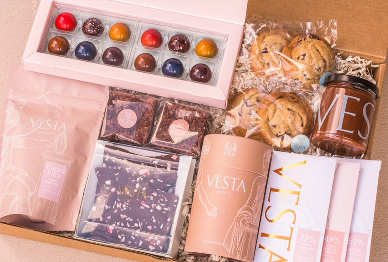 For the holidays, Vesta has put together a collection of gift boxes, including Vegan Luxe ($110); Hot Chocolate Sampler ($110); Signature Brownies + Cookies ($65) and Bean to Bar Trio ($25).